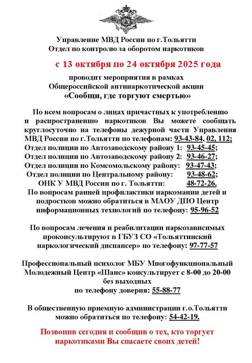 В целях повышения эффективности борьбы с наркоманией и наркопреступностью, привлечения общественности к решению этой проблемы Управление МВД России по г. Тольятти во взаимодействии с учреждениями антинаркотической профилактики, лечения и реабилитации наркозависимых, органами местного самоуправления и общественными объединениями проводит в период с 13 октября 2025 года по 24 октября 2025 года - II этап Общероссийской антинаркотической акции «Сообщи, где торгуют смертью!».